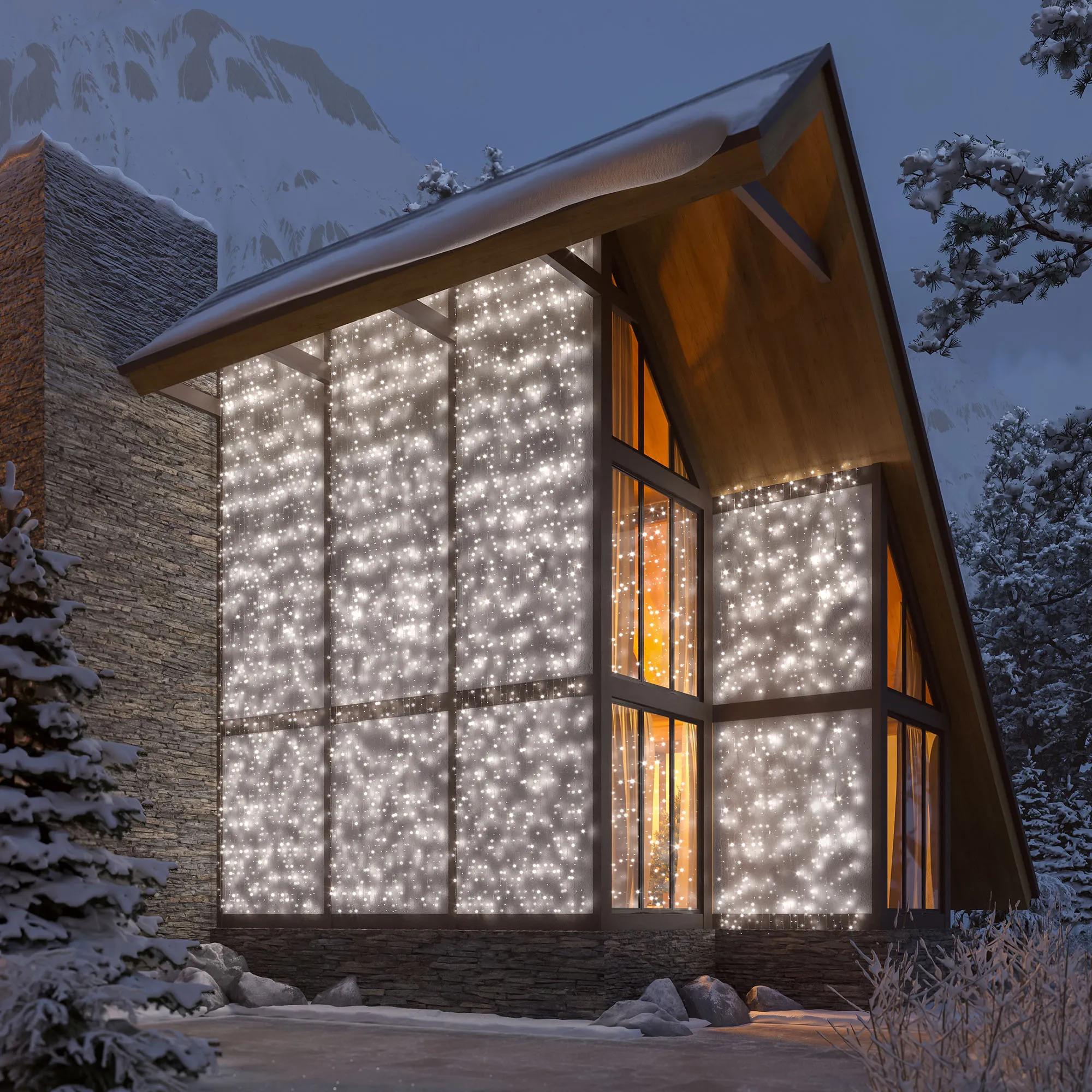 Светодиодный Занавес Classic. Размер 2000x9000 мм (длина 2000 мм, высота 9000 мм). 20 ниспадающих нитей длиной 9000 мм. 2200 светодиодов размером 7 мм. Цвет свечения БЕЛЫЙ (6000 К), постоянное свечение и 8 динамических эффектов с резким световым рисунком (прозрачная вогнутая линза). Провод прозрачный, ПВХ. Питание 230 В, Мощность 120 Вт, защита IP65, применение в помещении и на улице под навесом. Аксессуар для подключения и выбора режима свечения в комплекте.
