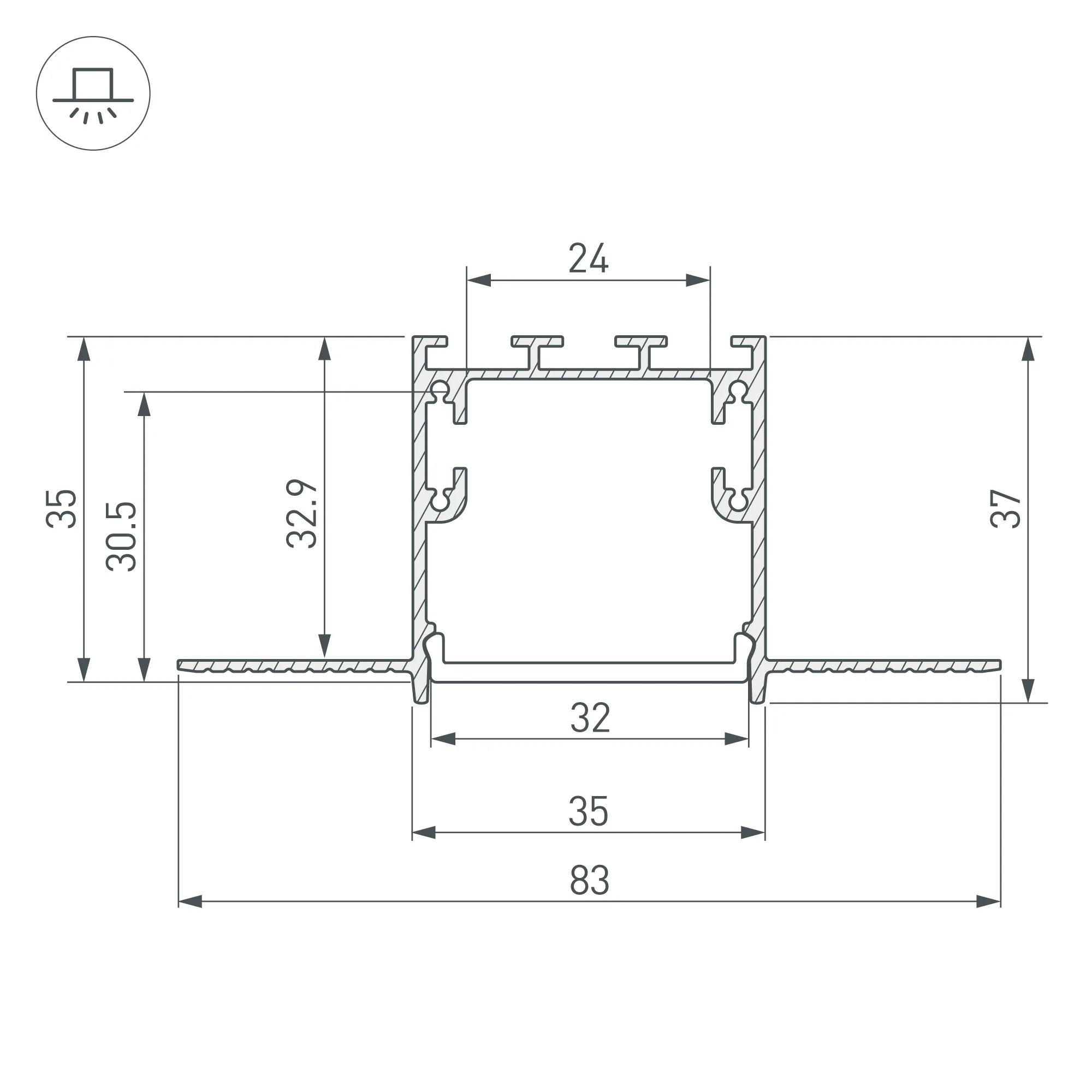 Алюминиевый анодированный профиль для светодиодных лент и линеек. Габаритные размеры (L×W×H): 2000x83x35 мм. Паз для установки 35х35 мм. Ширина площадки для ленты 24 мм. Экраны, заглушки и другие аксессуары приобретаются отдельно. Цена за 1 метр.