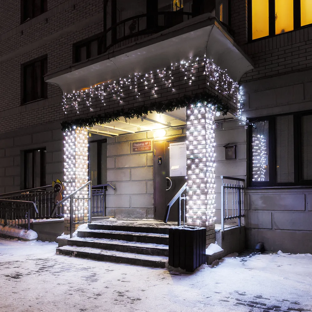 Светодиодная бахрома Pro. Размер 5600 мм (длина 5600 мм, по длине 48 нитей высотой 200/900 мм). Количество светодиодов 240 шт размером 7 мм. Основной цвет свечения БЕЛЫЙ (6000 К), эффект мерцания редких точек БЕЛЫЙ (6000К) с мягким световым рисунком (выпуклая молочно-белая линза), соотношение светодиодов: 198 белых постоянного свечения / 42 белых с мерцанием. Эффект частого мерцания. Провод черный, каучук. Питание 230 В, Мощность 6 Вт, защита IP65, применение на улице под навесом. Аксессуары для подключения приобретаются отдельно.