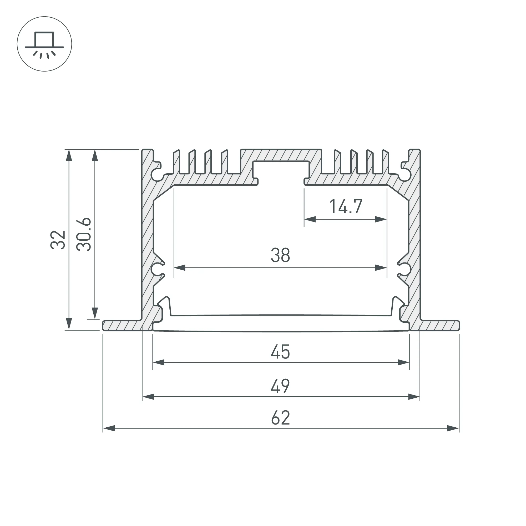 Алюминиевый анодированный профиль для светодиодных лент и линеек. Габаритные размеры (L×W×H): 3000x62x32 мм, паз для установки 49 мм. Ширина площадки для ленты 38 мм. Экраны, заглушки и другие аксессуары приобретаются отдельно. Цена за 1 метр.