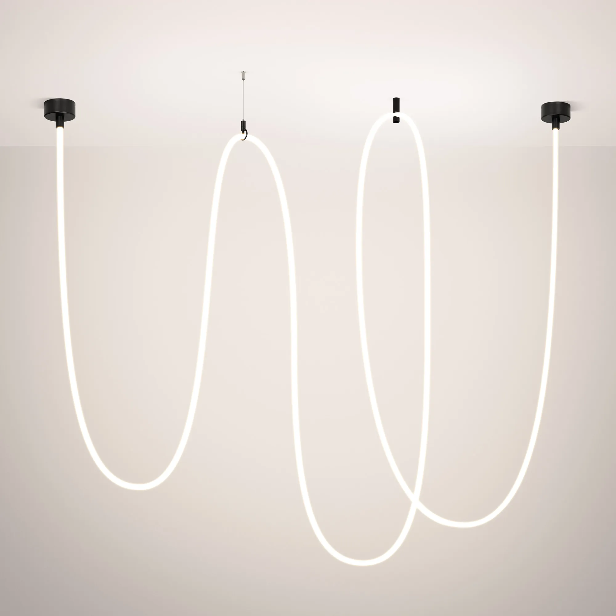 Подвесной светильник. Мощность 110 Вт, св. поток 5960 лм, 54 лм/Вт, тёплый 3000 K, CRI>90, угол 360°, напряжение питания 230 В. Черный круглый корпус из стали, силиконовая герметичная лента, степень защиты IP20. Размер: общая высота чаши 85 мм, высота чаши без вывода под неон 50 мм, диаметр вывода под неон 35 мм, диаметр чаши 130 мм, диаметр силиконовой герметичной ленты 18 мм, длина силиконовой герметичной ленты 10000 мм. Монтаж накладной. Блок питания 24 В, 2500 мА, пульсация <5% (2 шт.). Аксессуары (подвес и крепление) приобретаются отдельно.