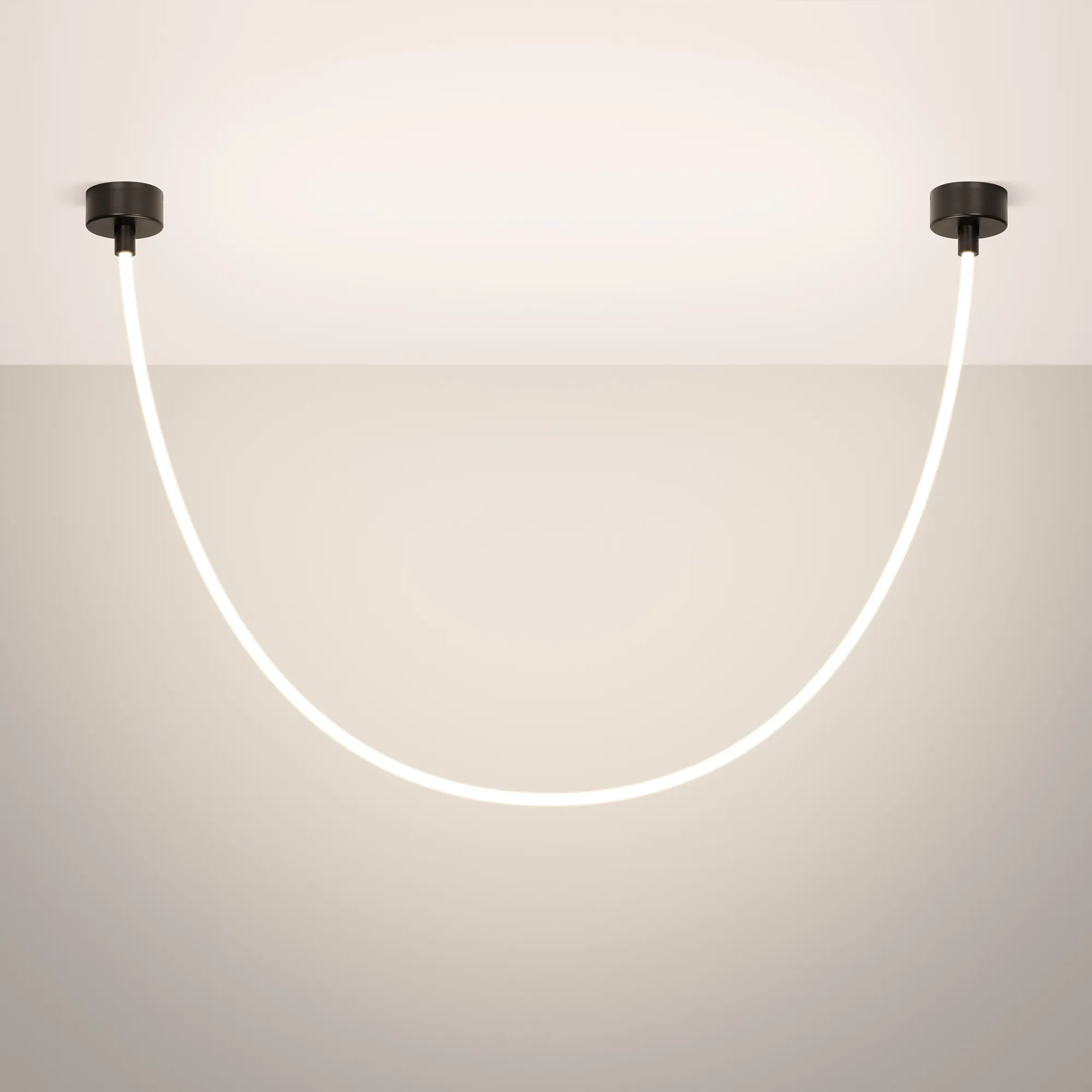 Подвесной светильник. Мощность 36 Вт, св. поток 2080 лм, 57 лм/Вт, тёплый 3000 K, CRI>90, угол 360°, напряжение питания 230 В. Чёрный круглый корпус из стали, силиконовая герметичная лента, степень защиты IP20. Размер: общая высота чаши 85 мм, высота чаши без вывода под неон 50 мм, диаметр вывода под неон 35 мм, диаметр чаши 130 мм, диаметр силиконовой герметичной ленты 18 мм, длина силиконовой герметичной ленты 2500 мм. Монтаж накладной. Блок питания 24 В, 1880 мА, пульсация <5%.