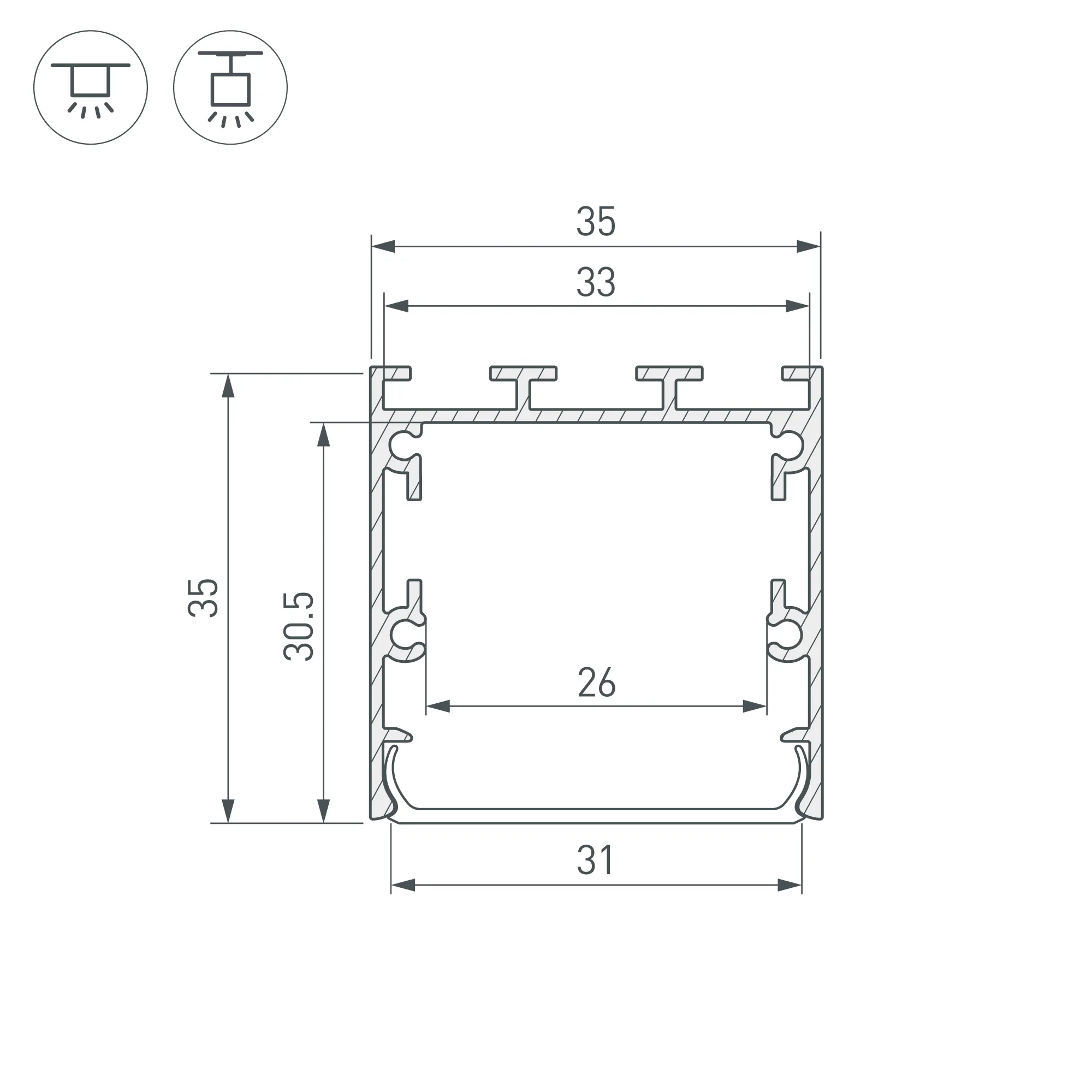 Алюминиевый профиль для светодиодных лент и линеек. Цвет - черный RAL9005 (порошковая окраска). Габаритные размеры (L×W×H): 2000x35x35,5 мм. Ширина площадки для ленты 26 мм. Экраны, заглушки и другие аксессуары приобретаются отдельно. Цена за 1 метр.