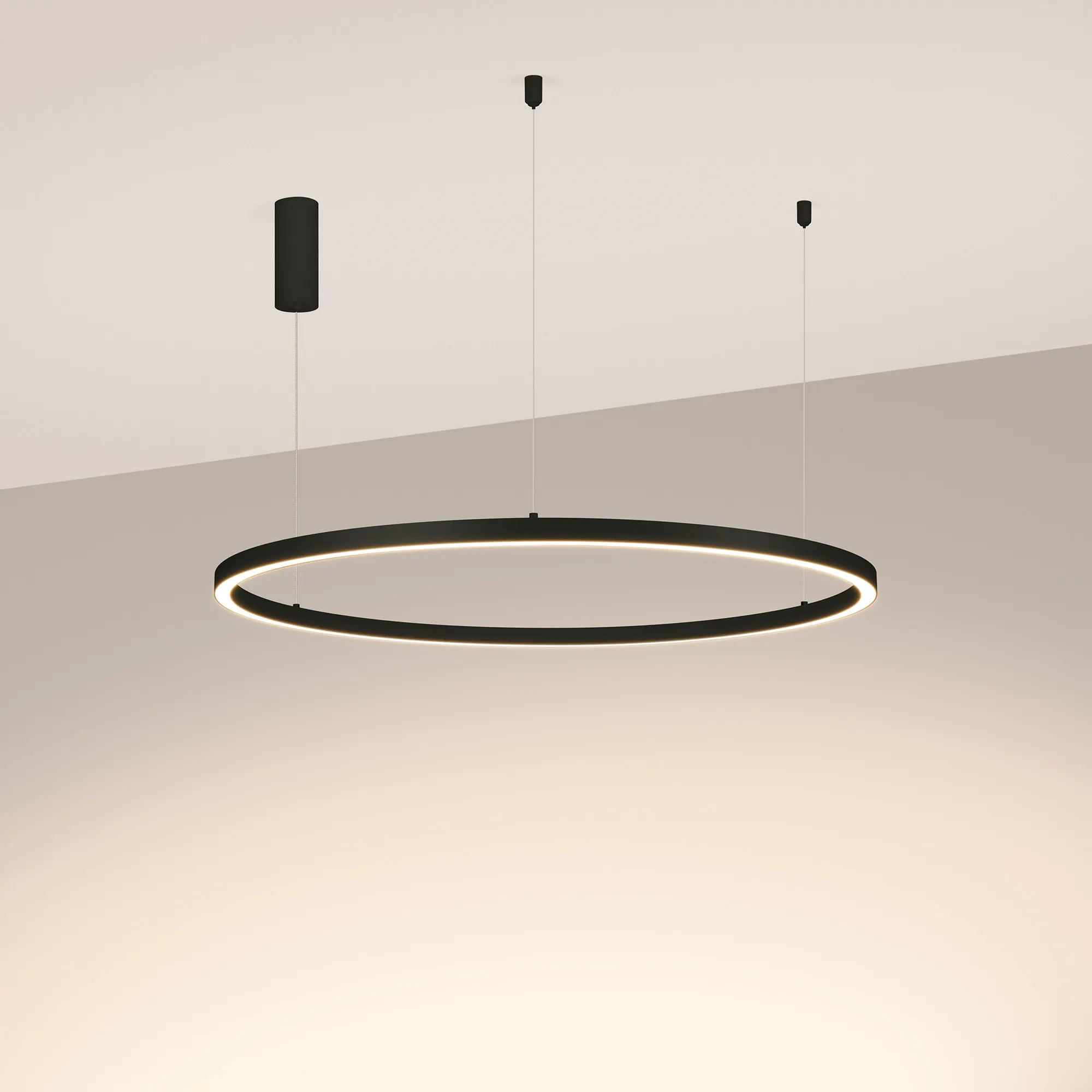 Подвесной светильник. Мощность 42 Вт, св. поток 2520 лм, 60 лм/Вт, теплый 3000 K, CRI>90, угол 120°, напряжение питания 230 В. Черный круглый корпус из алюминия, экран силикон, степень защиты IP20. Размер: диаметр 800 мм, высота 25 мм, ширина профиля 25 мм, размер чаши: диаметр 60 мм, высота 150 мм. Питание AC220-240В, 42Вт. Драйвер:115 x 40 x 28 мм, 33-40В, 1050 мА. Пульсация <5%. Монтаж подвесной, длина подвеса 1200мм.
