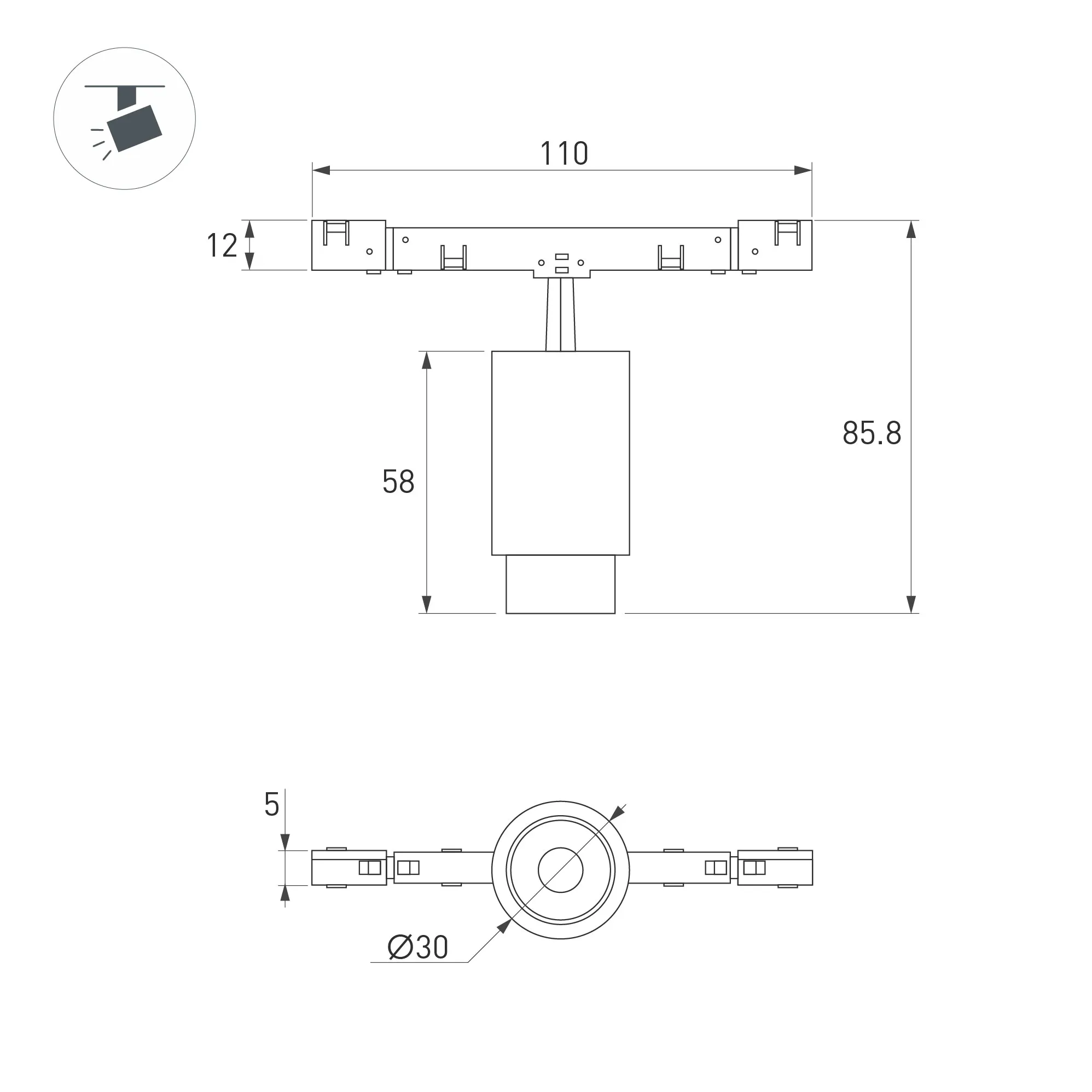 Светильник для магнитных треков MAG-MICROCOSM шириной 11 мм. Мощность 2 Вт, св. поток 144 лм, 79 лм/Вт, дневной 4000 K, CRI>92, изменяемый угол 15-45°, напряжение питания 24 В. Черный фигурный корпус из алюминия, экран поликарбонат, степень защиты IP20. Габариты общие: 110 х 30 х 84 мм, габариты светового модуля Ø30 х 58 мм, габариты адаптера 110 х 5 х 11,6 мм. Монтаж на трек MICROCOSM. Пульсация <1%.